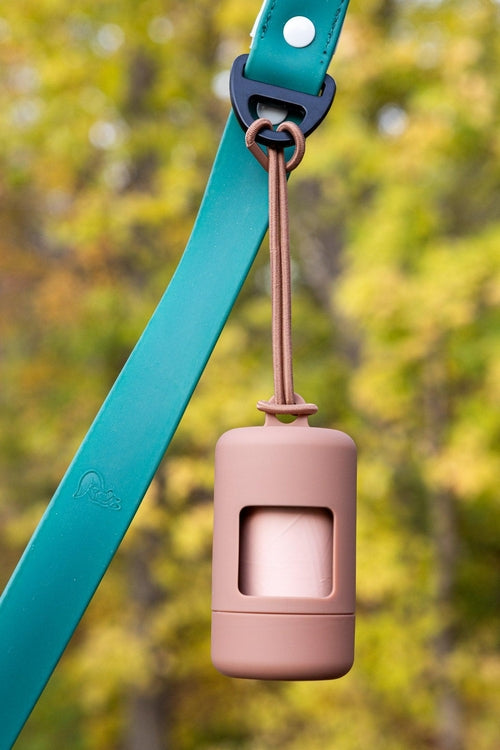 A proper home for poop bags. The elastic attachment that plays well with both the waterproof and vegan leather leashes. Easy-twist top for quick re-loads. Size: 3.5" x 1.75".